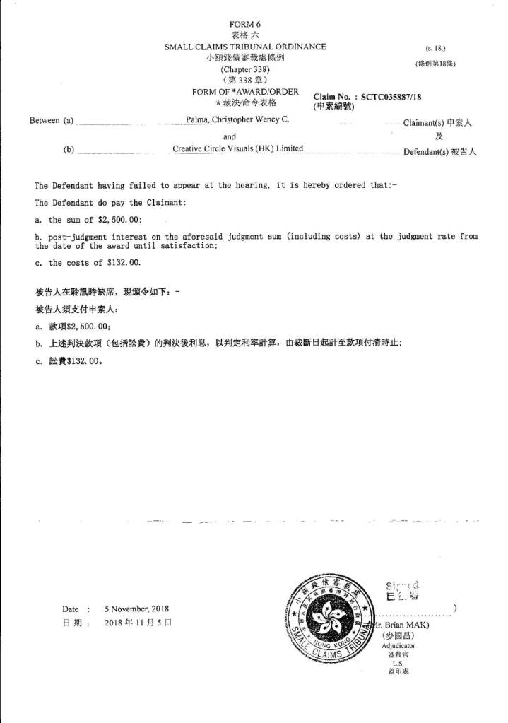 Victor Fraile’s previous company Creative Circle Visuals (HK) Ltd was sentenced to pay freelance photographer Christopher Palma for his work